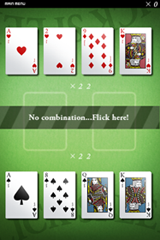 When no further combinations are possible, the “No Combination… Flick Here!” bar shown above will appear. Flicking the bar will continue play. Be sure to check the cards in your hands, so you will be quickly able to play any consecutive numbers to the two new cards which will appear in the center discard piles.